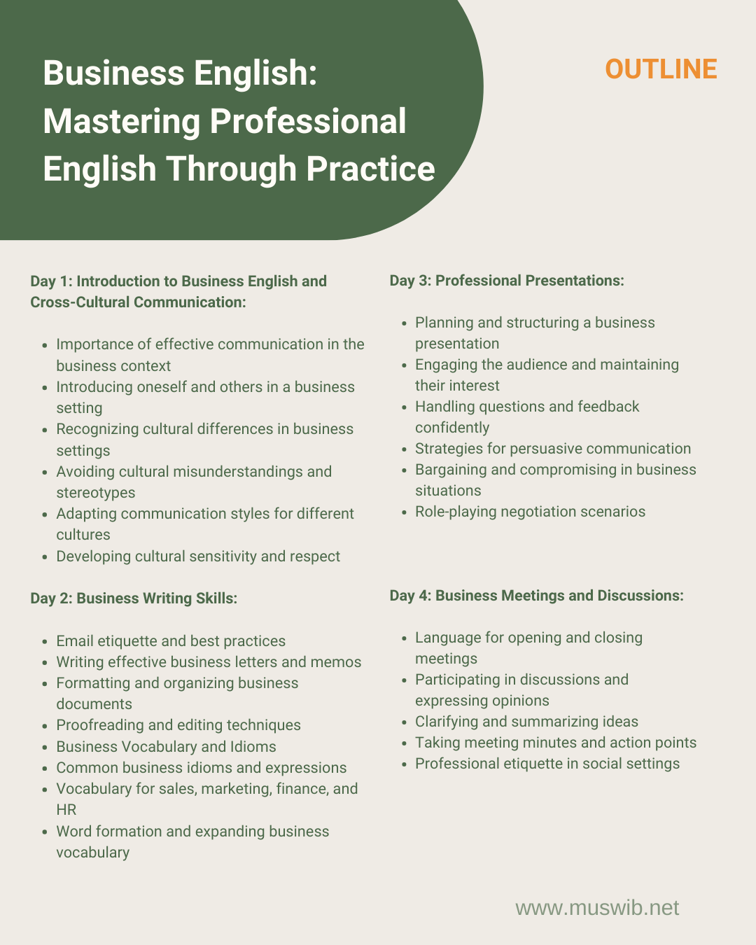Enhanced Professional Communication: Participants will develop advanced verbal and written communication skills in English, enabling them to confidently engage in complex business discussions, negotiations, and correspondence.